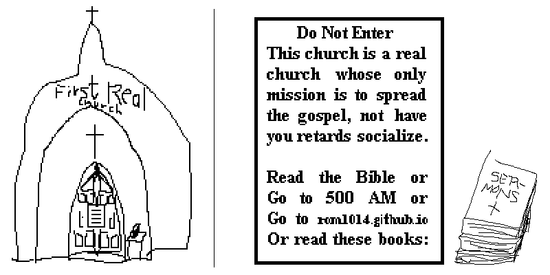 Just don't go, man! Down with churches, man! If you're gonna build a church, may it just be so it's pretty and remind people of God, but just put a sign that says "Read the Bible", "Read these sermons", "Listen to our radio station", or "Visit our website for sermons" and "If you want to socialize, go put up a sign that says 'I WANT FRIENDS.' Just don't come here trying to meet people pretending you care about God."